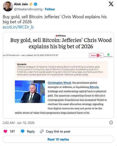 FX168財經報社(北美)訊 在經歷了數月的動盪後,加密市場似乎正趨於穩定,但市場的信心依然脆弱。華爾街著名策略師、傑富瑞(Jefferies)全球股票策略主管克里斯托弗·伍德(Christopher Wood近期做出了一個引發輿論譁然的選擇:他將模型組合中10%的比特幣持倉移除,並將這部分資金等額投入實物黃金與金礦股。這是一個極具象徵意義的舉動——這位曾將比特幣視爲黃金數字化替代品的意見領袖,如今認爲量子計算的進步已對比特幣網絡的密碼學安全構成了實質威脅。