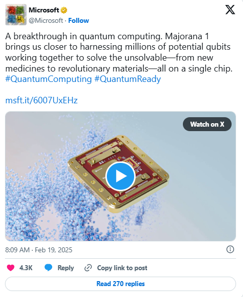 關於「量子威脅」的討論並非新聞,但其規模正達到前所未有的程度。2025年2月,微軟展示了 Majorana 1 芯片,這一量子計算原型據稱將加速「Q日」(即現有加密技術崩塌之日)的到來。自此,加密社區一直緊盯着這一進展。