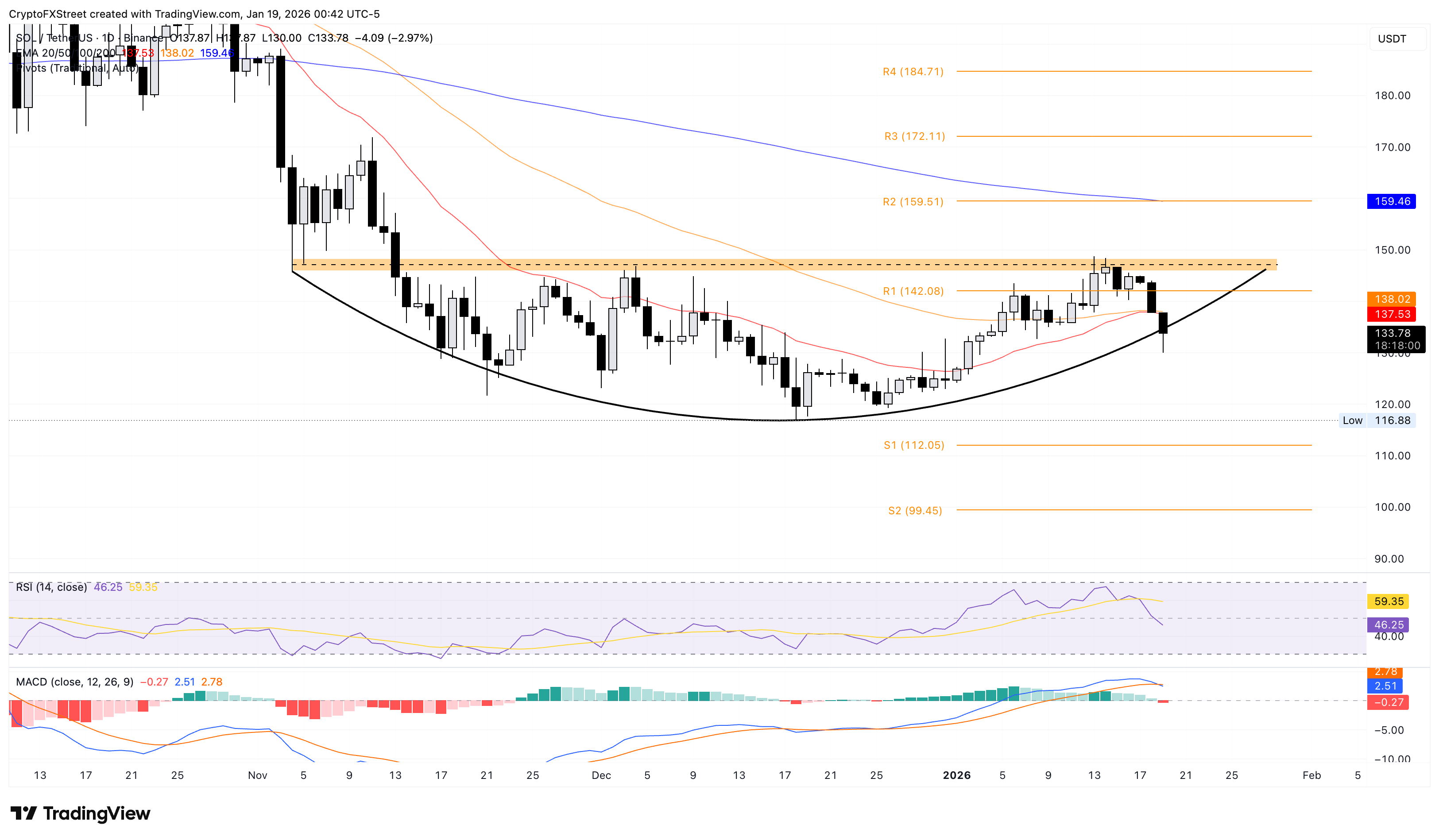 索拉納仍然承受著強烈的賣壓,交易價格接近130美元,低於20日和50日指數移動平均線(EMAs)137-138美元,短期偏向向下。索拉納的持續下行趨勢可能會打破12月18日116美元低點的圓底圖形。