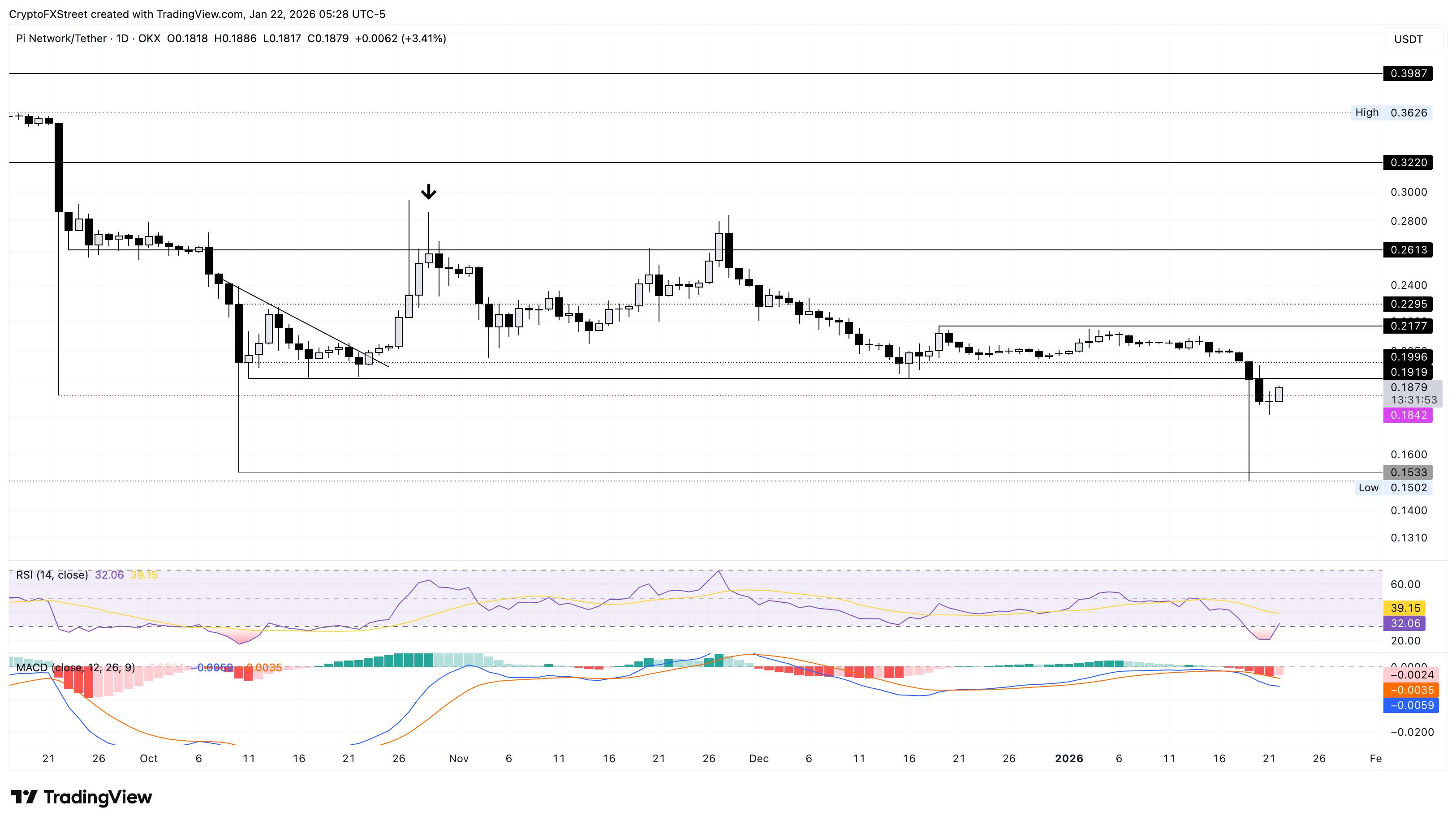 然而,潛在的反轉將使 PI 進入支撐發現階段,深層區域位於 $0.1533 和 $0.1502 的 10 月 10 日和 1 月 19 日低點之間。