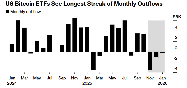 (美國比特幣ETF出現最長月度資金流出連跌 來源:彭博)