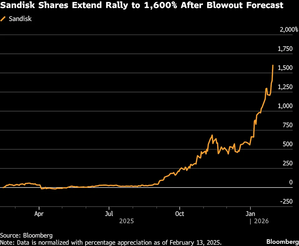 FX168財經報社(北美)訊 數字存儲公司閃迪(Sandisk Corp.)強勁的營收與盈利指引,推動其延續「狂飆」走勢,鞏固其在標普500指數中年內表現最佳個股的地位。隨着市場資金從「砸錢建AI」的科技巨頭,轉向真正受益於AI基礎設施投入的產業鏈環節,存儲與記憶體板塊成爲新的追捧對象,而Sandisk被視爲這一輪「數據中心/AI週期」的核心受益者之一。#AI熱潮:從芯片到資本的競賽#