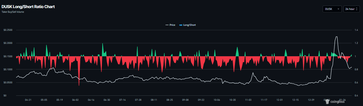 CoinGlass數據顯示,週二DUSK的多空比為1.02,並且穩步上升。高於1的比率反映出市場的看漲情緒,因為更多的交易者押注於資產價格上漲。