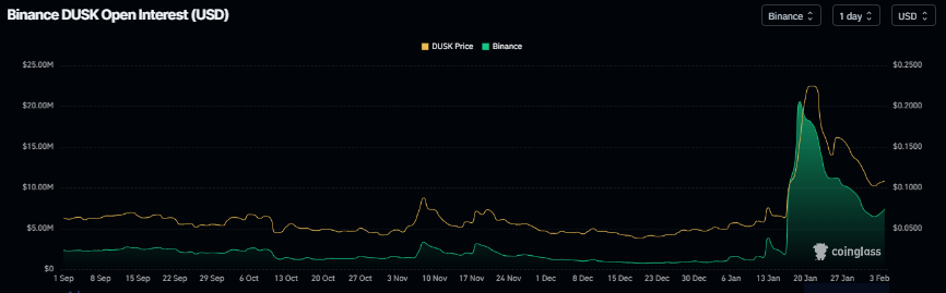 此外,DUSK在Binance交易所的期貨未平倉合約(OI)週二從前一天的650萬美元上升至742萬美元,經過自1月中旬以來的急劇下跌,如下圖所示。這一未平倉合約的溫和回升反映出投資者參與度的增加,並指向積極的前景。