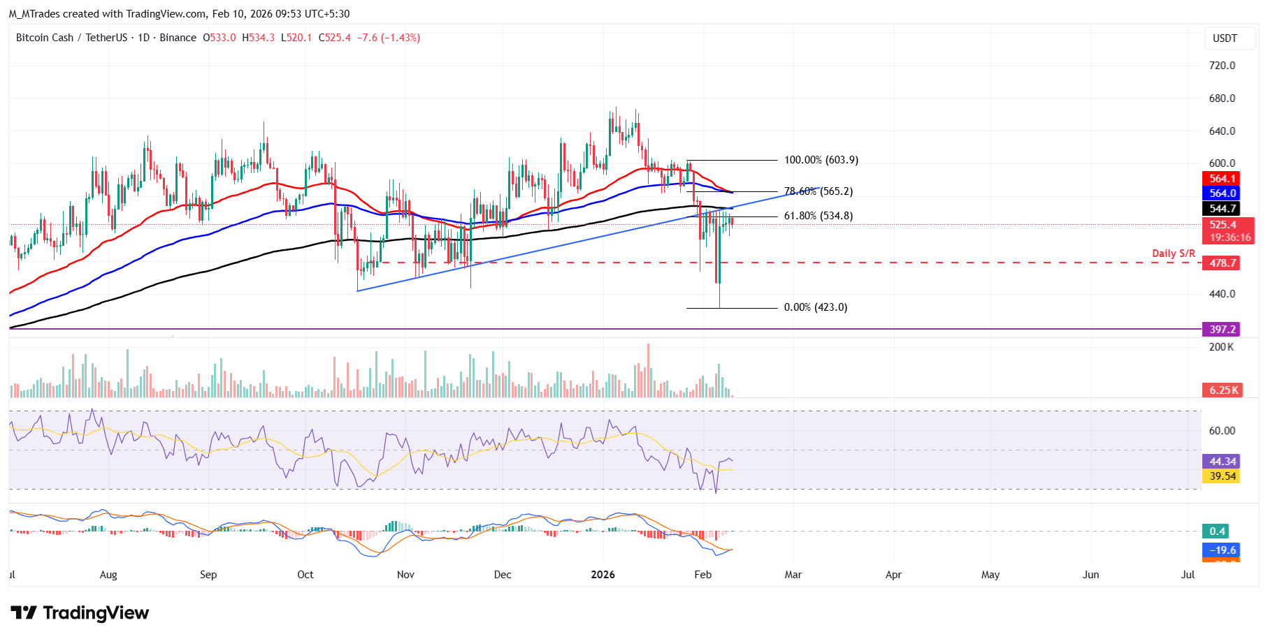 比特幣現金價格在61.8%斐波那契回撤位(從1月27日603.90美元的高點到2月6日423.00美元的低點)534.80美元處遭遇多次拒絕。該水平大致與之前突破的上升趨勢線和200日指數移動平均線(EMA)544.70美元相吻合,使其成為關鍵反轉區。