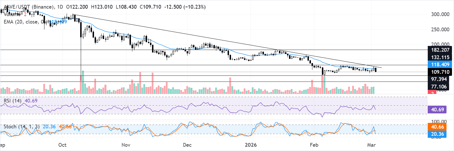 • AAVE在接近下降趨勢線阻力位時遭遇拒絕,跌幅近11%。