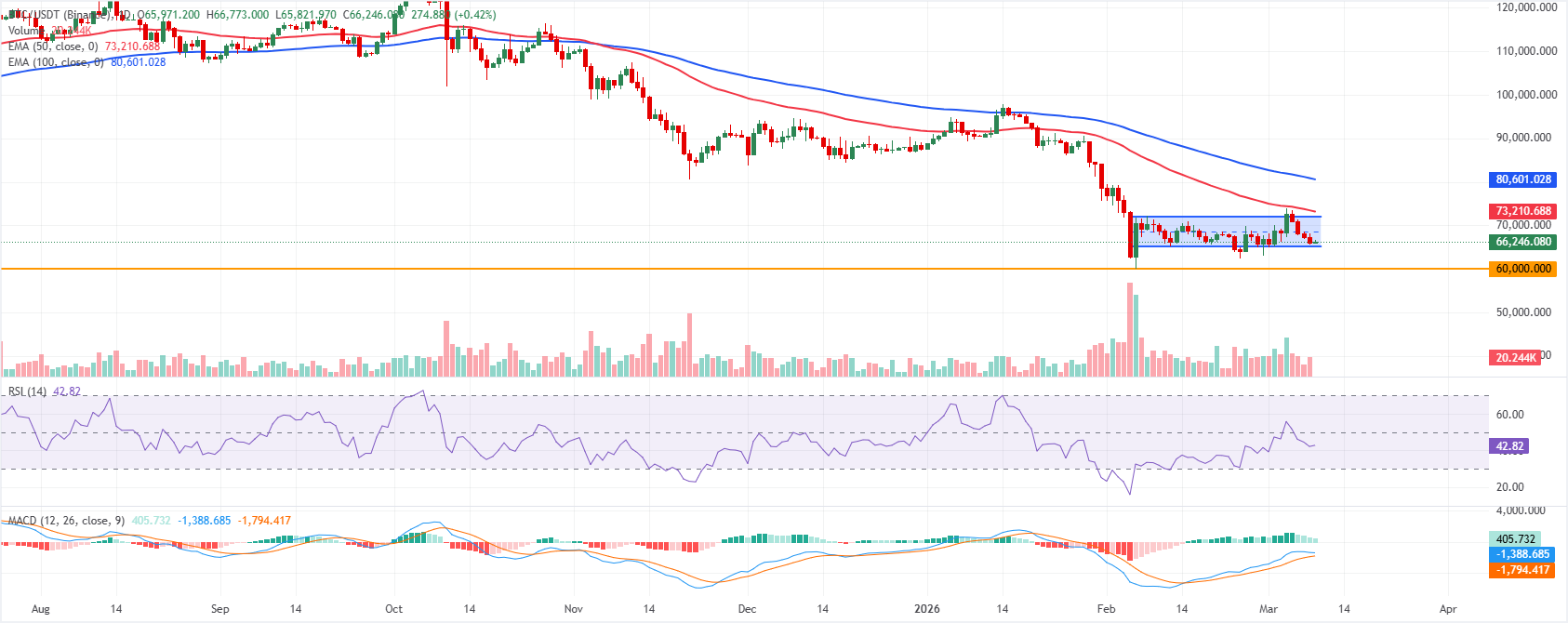 截至週一,比特幣價格為66,300美元。短期偏向略顯看跌,因為價格保持在一個平行通道內,交易接近下邊界,此前未能維持在70,000美元區域以上。加密之王仍遠低於50日和100日指數移動平均線(EMA),這兩條線繼續向下傾斜並限制整體趨勢,突顯出下行壓力。