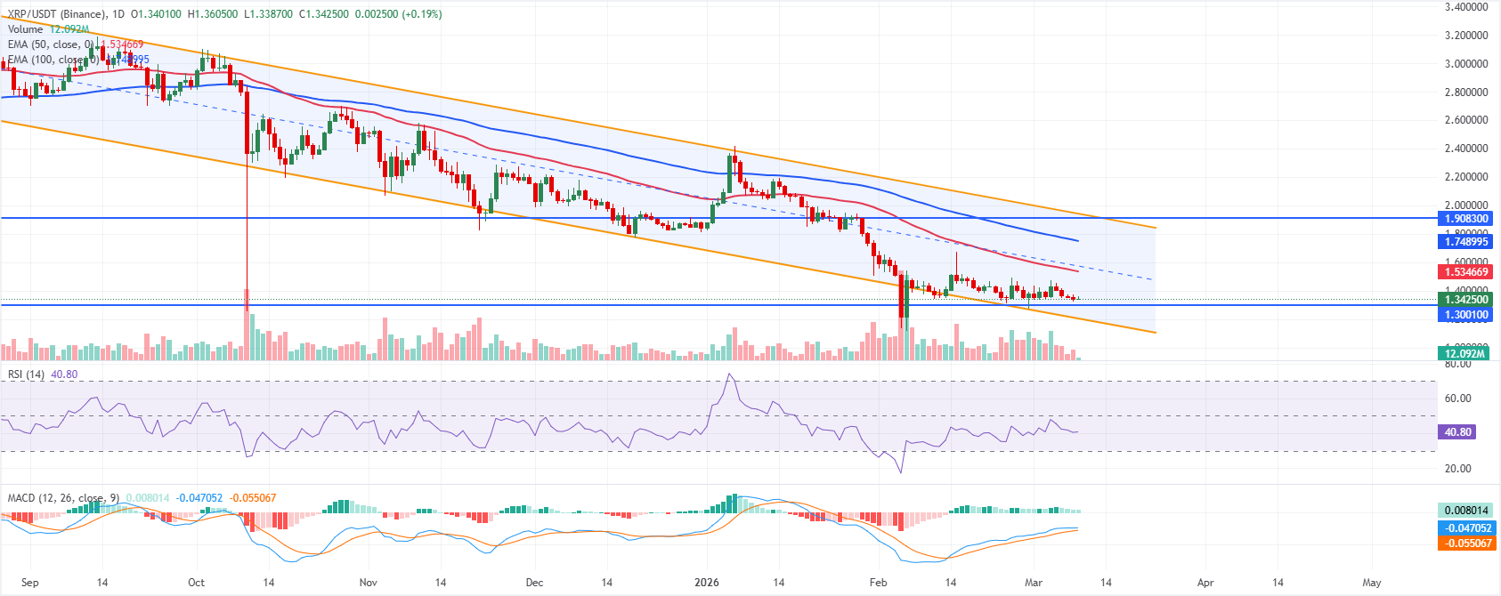 截至週一,XRP價格為1.34美元,仍然鎖定在從2.80美元以上的下降平行通道內,儘管最近從接近1.20美元的下邊界反彈,但整體短期偏向看跌。價格遠低於50日和100日EMA,這兩條線繼續向下傾斜並限制上行。