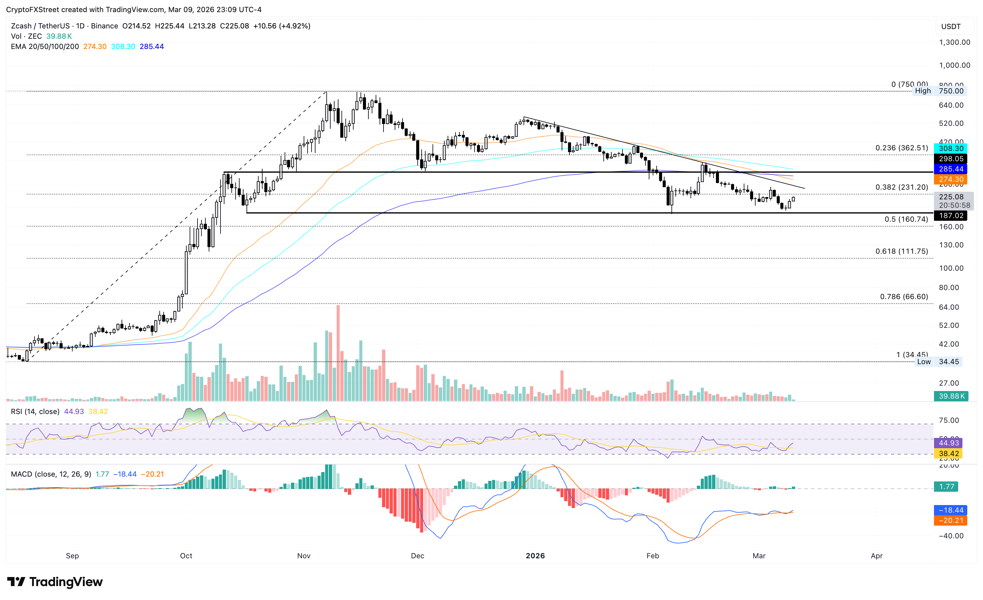 如果ZEC上漲超過250美元,可能會測試362美元的23.6%斐波那契回撤位,該水平是從8月20日的34.45美元低點到11月7日的750美元高點測得的。