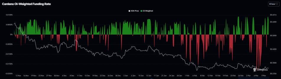與此同時,融資利率支持看漲的論點。CoinGlass的OI加權融資利率數據顯示,押注ADA價格進一步下滑的交易者數量低於預期價格上漲的交易者。該指標在週三轉為正率,目前在週四為0.0075%,表明多頭在支付空頭。