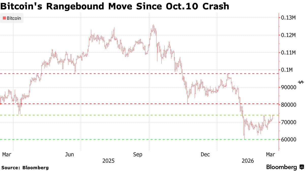 週一(3月16日)比特幣一度上漲3.6%,隨後收窄漲幅,截至發稿交投在73,600美元。近期每一輪反彈幾乎都在重複同樣的劇本,而且往往曇花一現,而市場的主要注意力則被油價、金屬和大宗商品的劇烈波動所吸引。