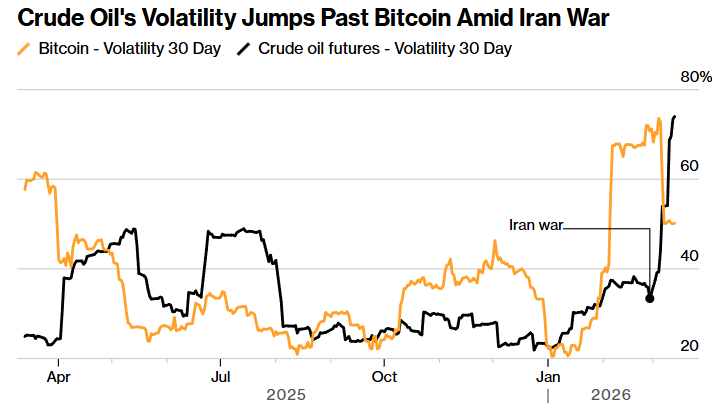 (伊朗戰爭期間,原油波動率已超過比特幣 來源:彭博)