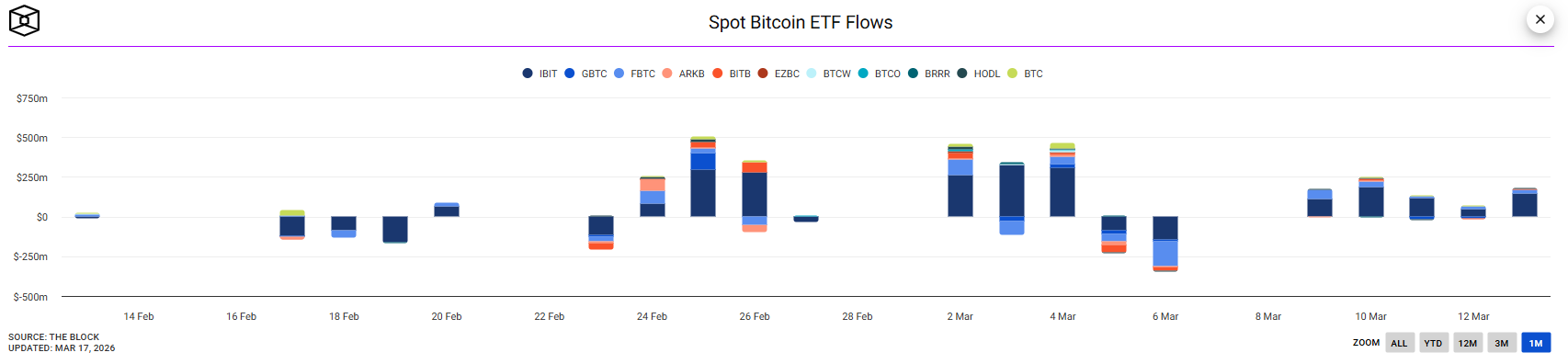 這種情緒改善也體現在比特幣市場指標上。在比特幣ETF領域,自3月9日以來資金持續流入,3月13日單日流入超過1.8億美元,且近幾個交易日沒有出現顯著資金流出。這表明機構參與度正在上升,資產需求也有所增強。