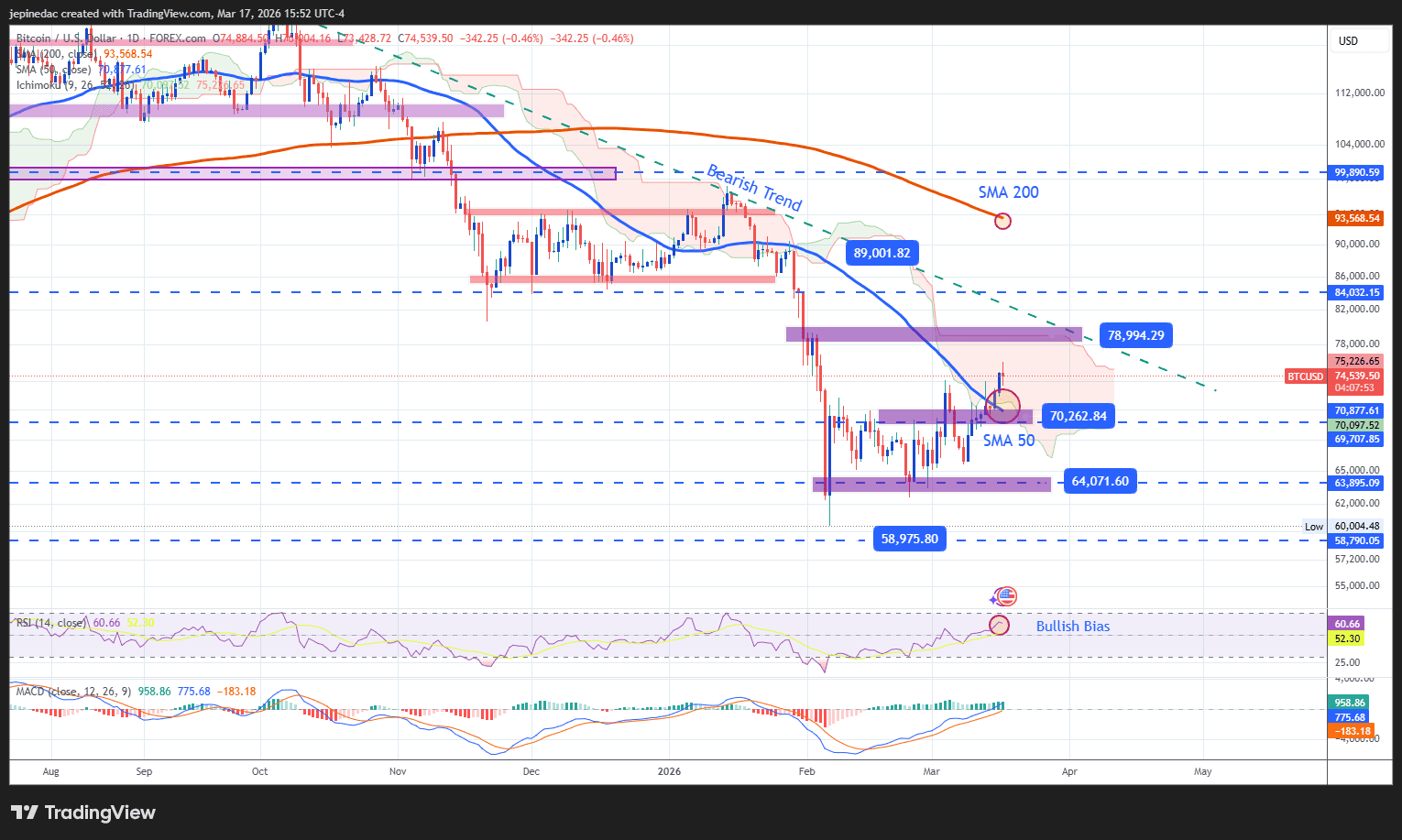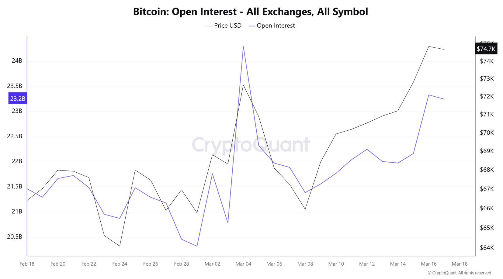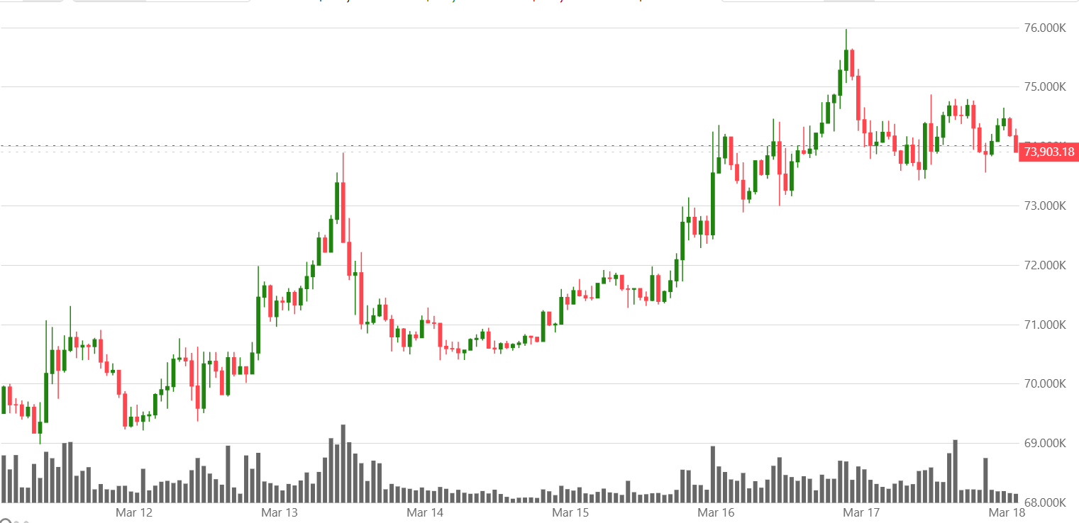 FX168財經報社(亞太)訊 在週三(3月18日)美聯儲利率決議出爐前,加密貨幣漲勢暫時停歇,目前比特幣徘徊在7.4萬美元附近。目前中東局勢依舊緊張,但市場開始呈現一種虛假平靜,這種情緒改善也令比特幣走勢獲得一定平穩。