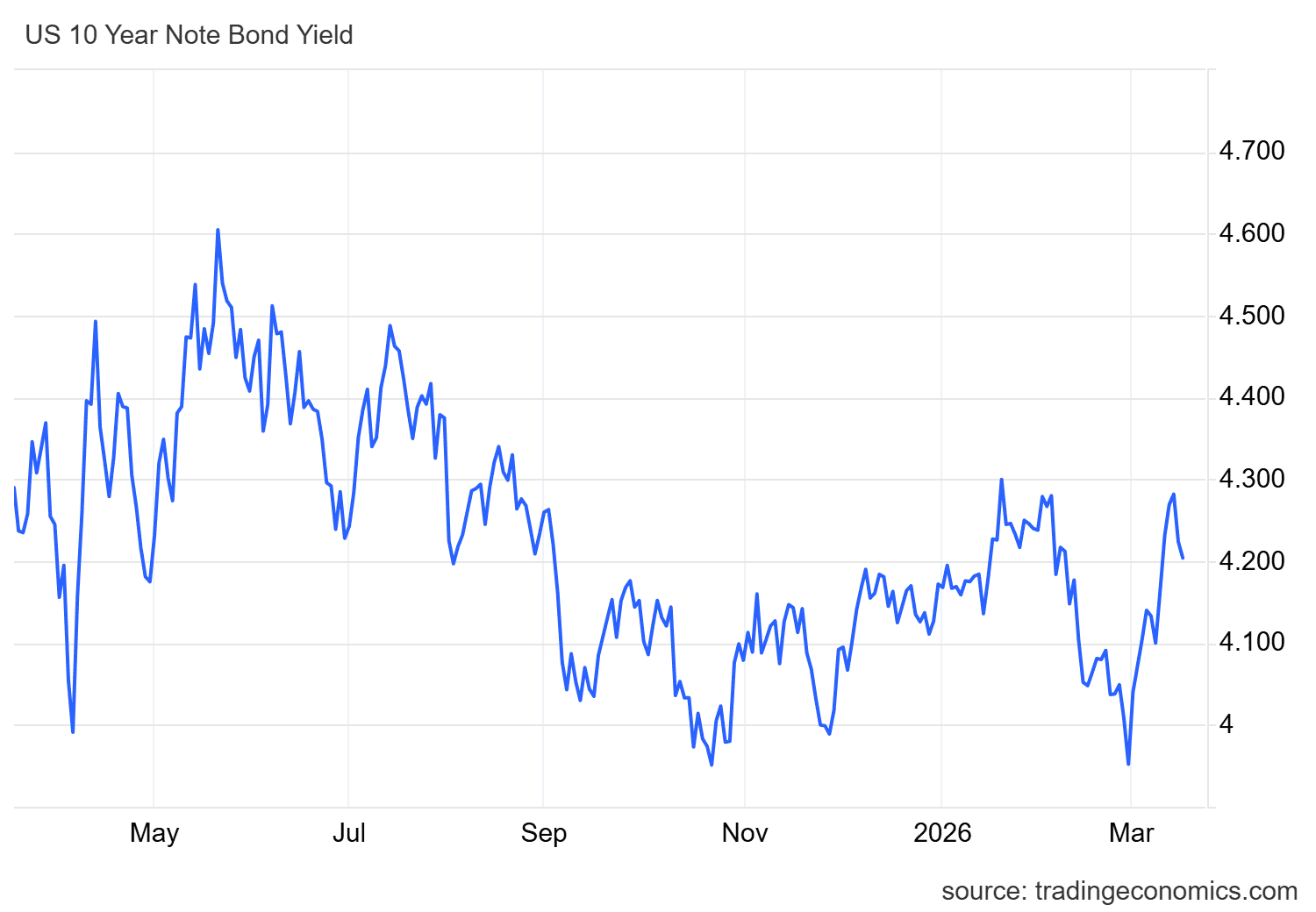 近幾周可以觀察到,當美國10年期國債收益率明顯上升時,包括加密貨幣在內的其他市場往往會失去吸引力。目前,美債收益率已從約4.3%回落至4.2%附近,反映出債券市場略有走弱,也讓比特幣等資產得以在短期內收復部分失地。