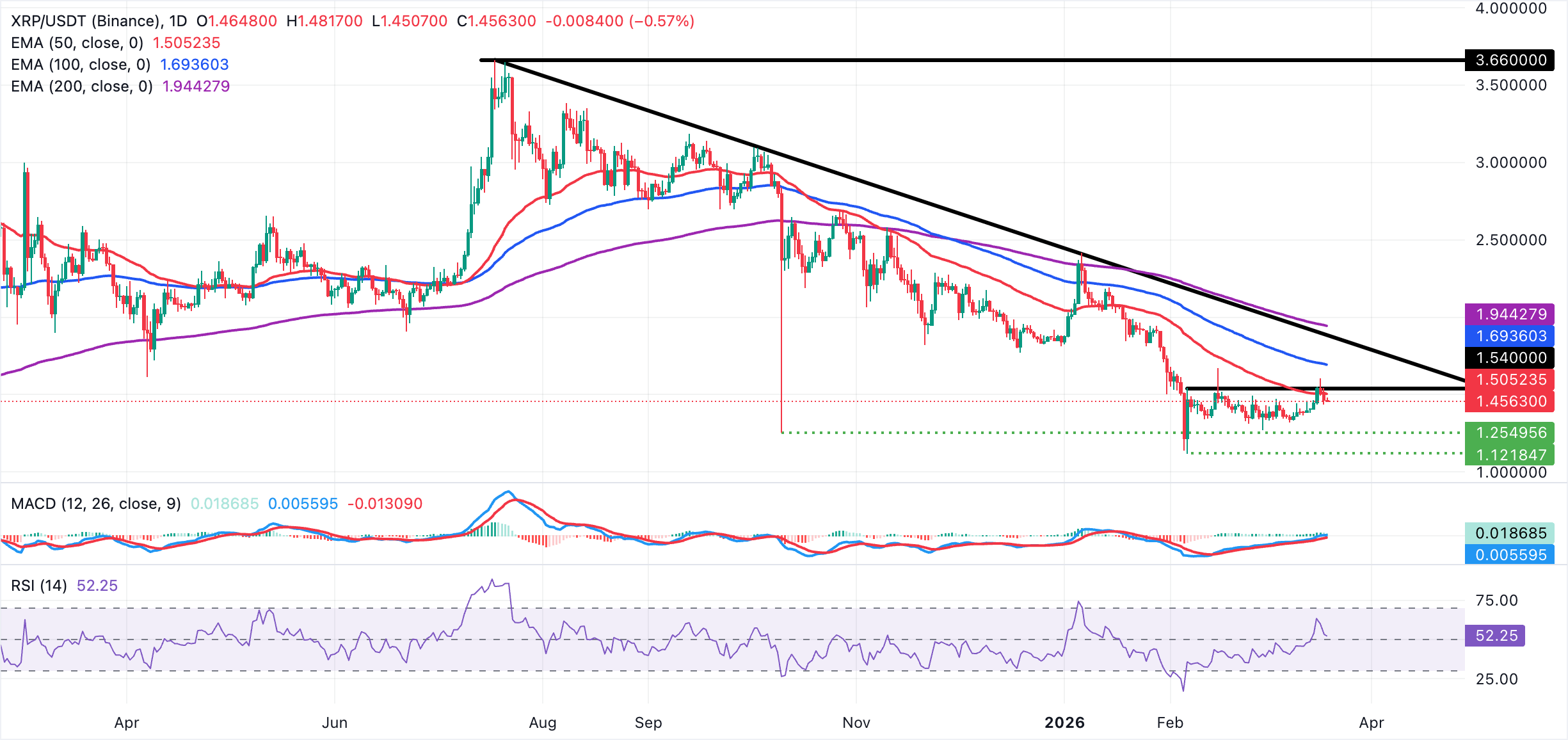至於瑞波幣,價格正測試週開盤價1.45美元作為短期看跌前景中的即時支撐。日線圖上的RSI為52,略高於中線,顯示出從60以上高點回落後的中性基調。