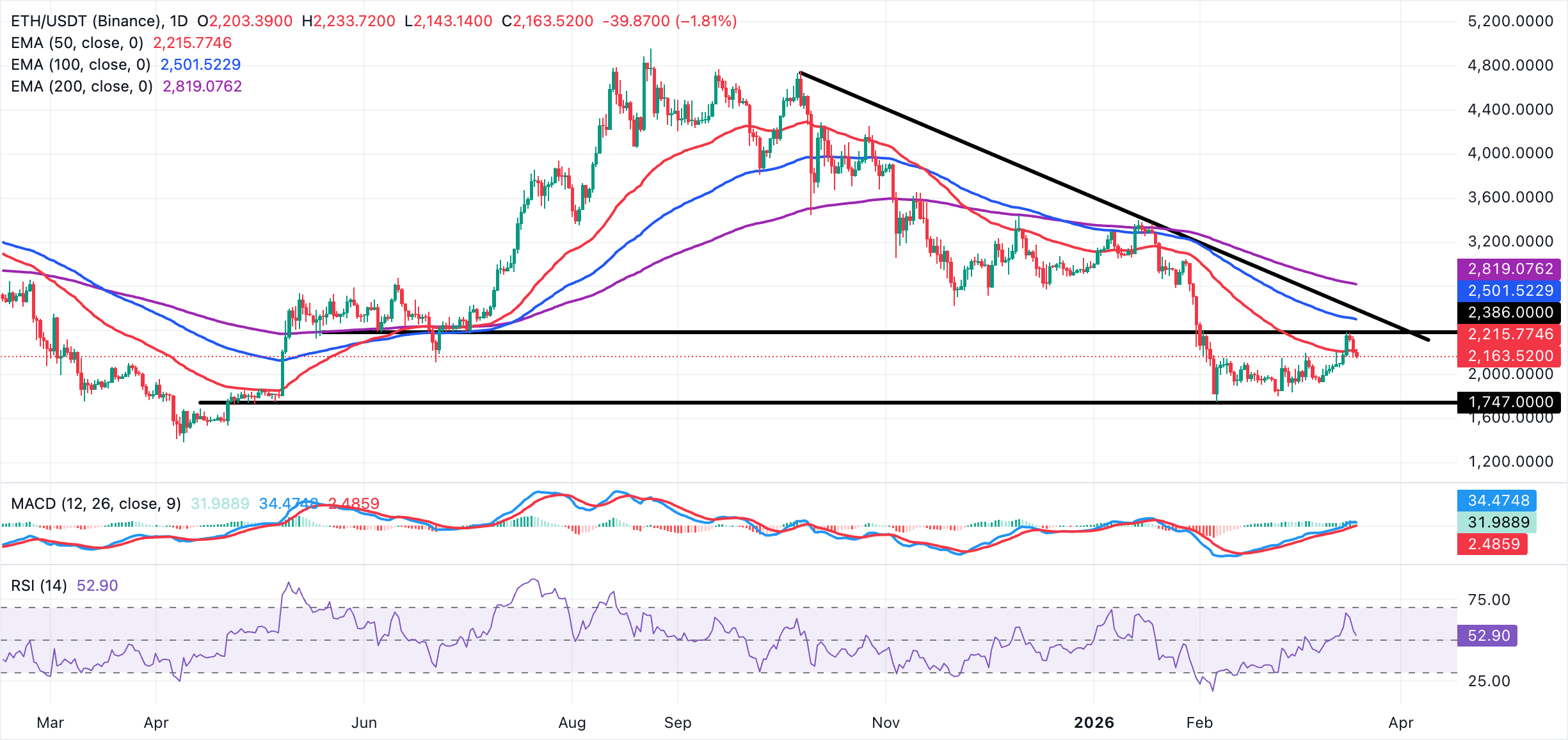 以太坊在從週高點2,386美元回調後,現交易於2,163美元。價格遠低於50日、100日和200日EMA,三者均持續下行,構成主導的下行背景。同時,長期下行趨勢線在最新反彈後依然未被突破,強化了更廣泛的下跌趨勢。