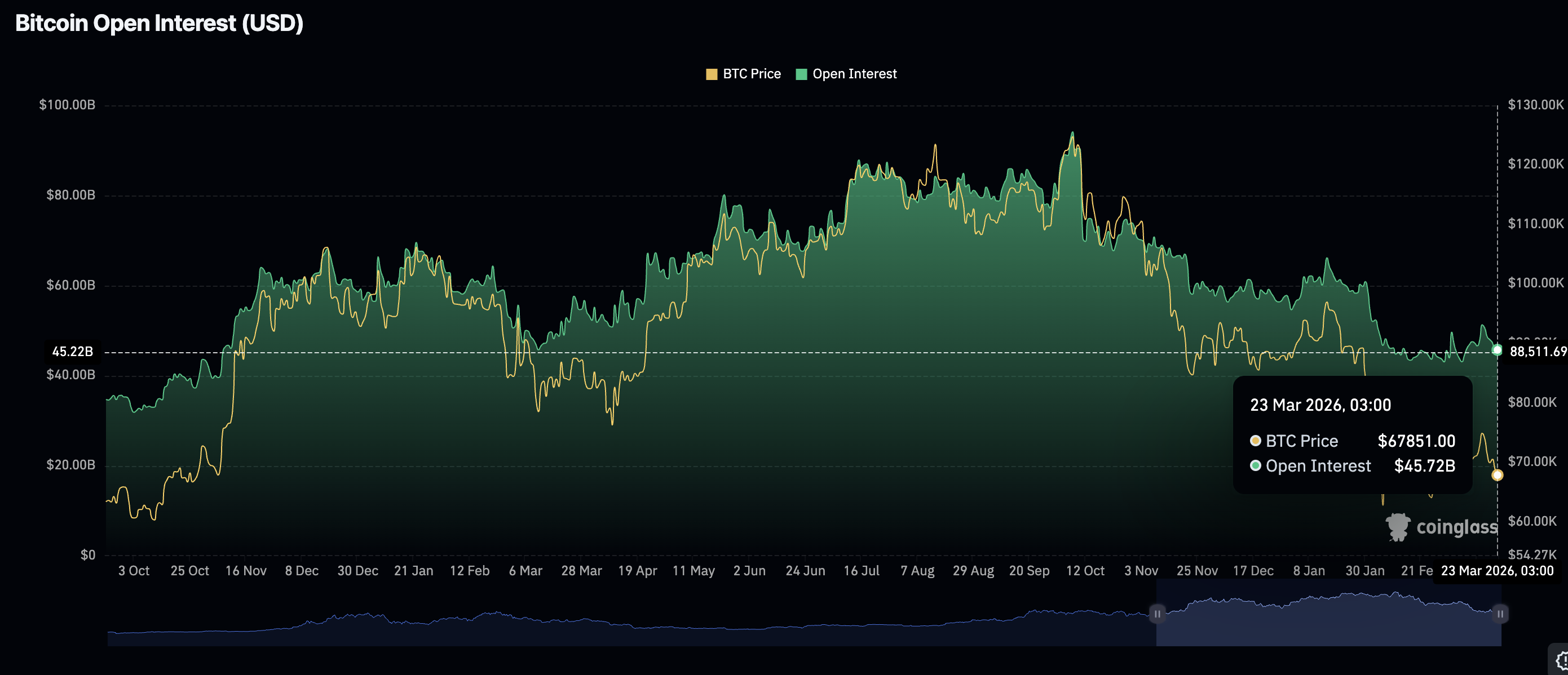 未平倉期貨合約的名義價值正在縮減,比特幣的未平倉合約(OI)週一降至457.3億美元,低於上週的512.9億美元峰值。