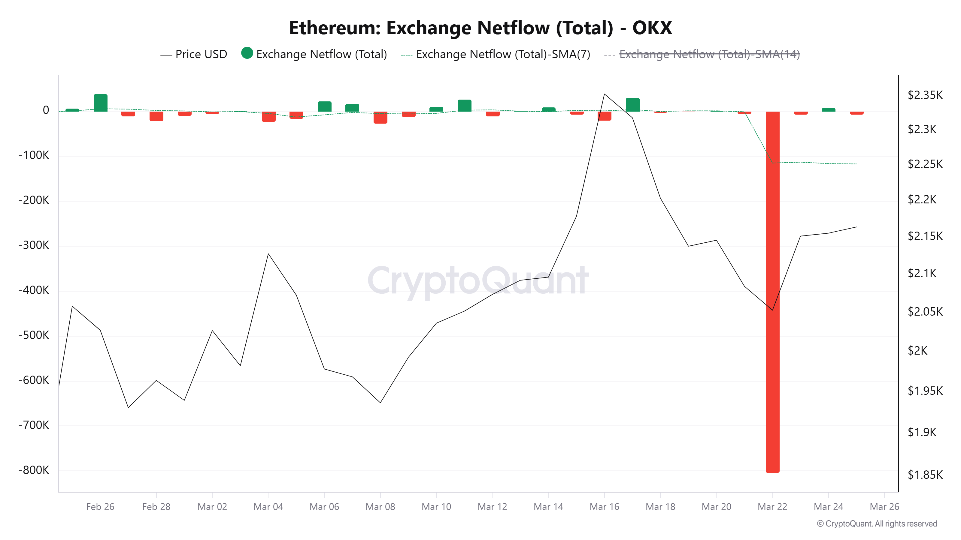 衡量加密貨幣交易所流入和流出幣量差額的交易所淨流量數據顯示,這一激增大部分來自OKX交易所的提幣。另一方面,這種僅由單一實體引發的激增可能是交易所錢包遷移,而非鯨魚積累。