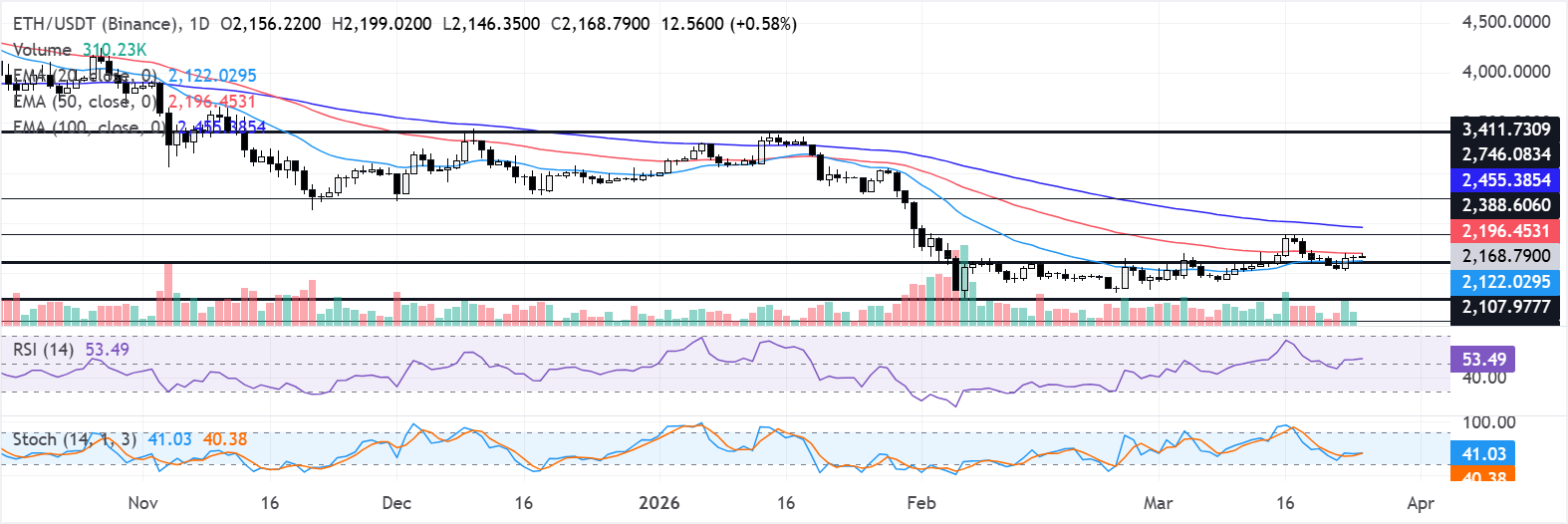 在日線圖上,ETH交易價格接近2,160美元。短期偏向溫和看漲,因價格維持在20日指數移動均線(EMA)2,120美元附近之上,並逐漸遠離此前約2,050美元的收盤價密集區。