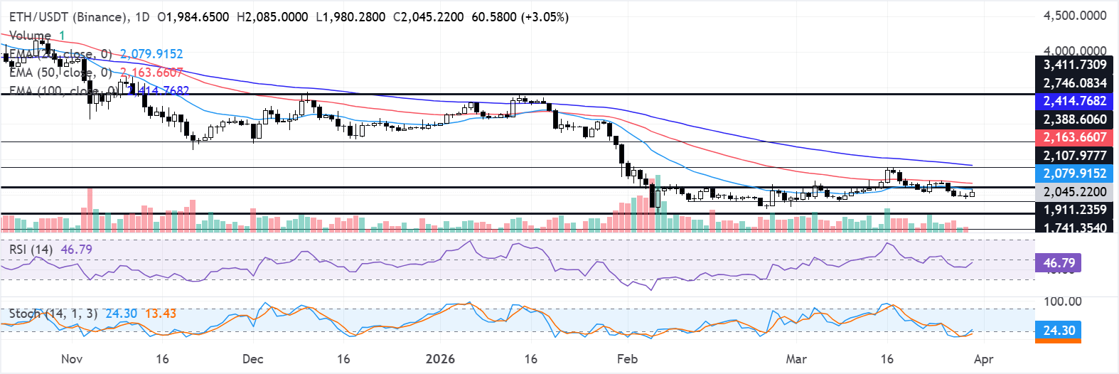 週一,ETH價格在測試20日指數移動均線(EMA)後,接近2020美元,略低於2108美元阻力位。若日收盤價能站穩該區域及50日EMA,將為價格衝擊2389美元打開通道,遠期看漲目標為2746美元。