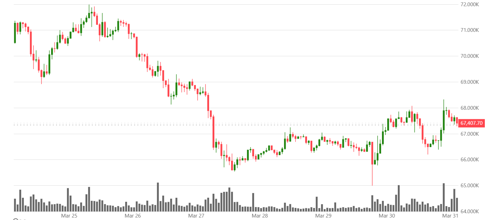 FX168財經報社(亞太)訊 週二(3月31日)比特幣從昨日跌破65,200美元的跌勢中恢復,目前交投在67,500美元附近,跟隨股市和債市上漲;隨着3月臨近結束,風險資產普遍收跌,主要山寨幣本週累計下跌3%至8%。投資者正在評估一則報道稱,美國總統唐納德·特朗普正考慮結束與伊朗的戰爭。