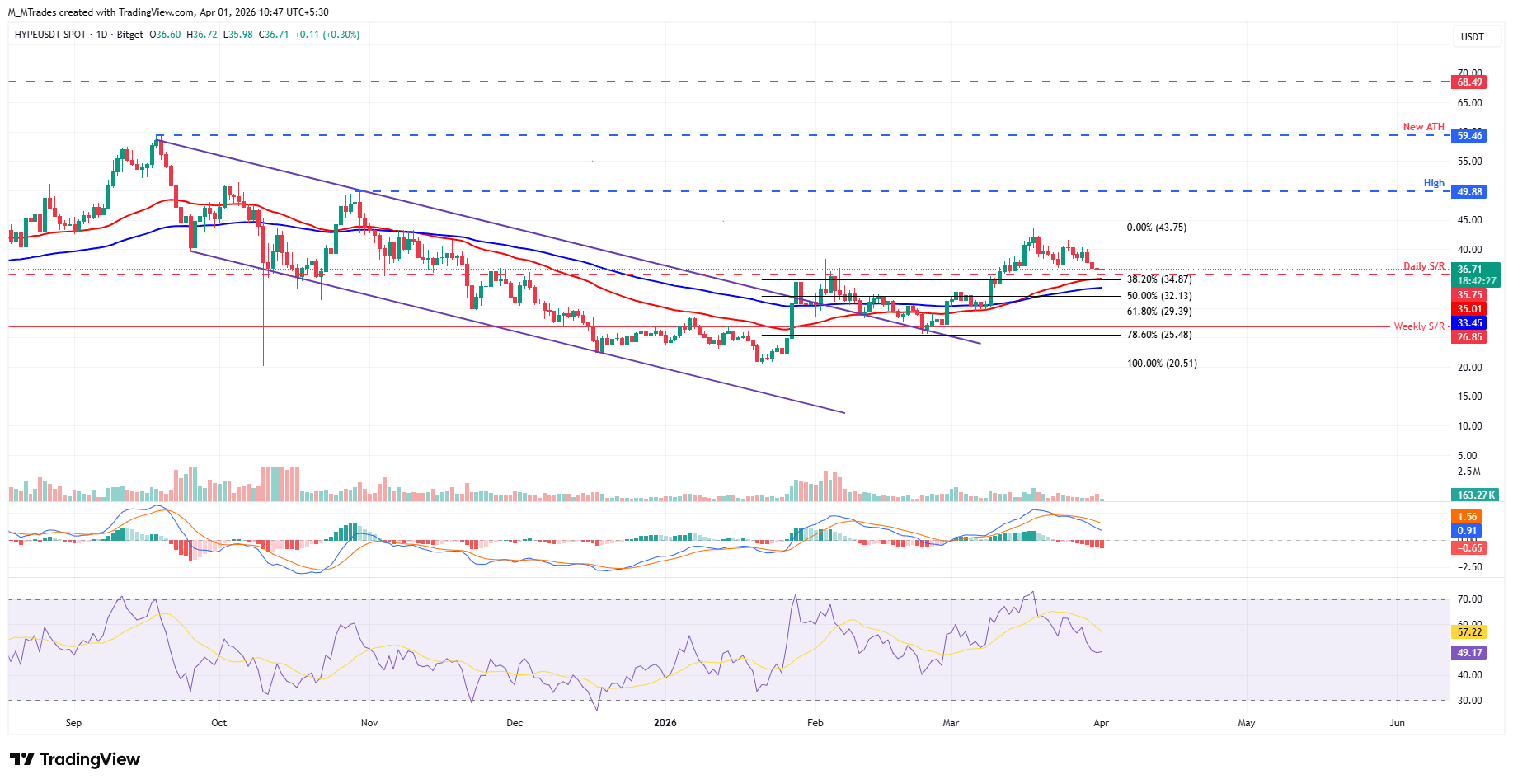 Hyperliquid 價格週三交易於 36.71 美元,自週日以來已回調超過 7%。週二,HYPE 重新測試了日線支撐位 35.75 美元,該位置大致與 50 日指數移動均線(EMA)35.01 美元和 38.20% 斐波那契回撤位 34.87 美元(從 1 月低點 20.51 美元至 3 月高點 43.75 美元繪製)重合,構成關鍵支撐區。