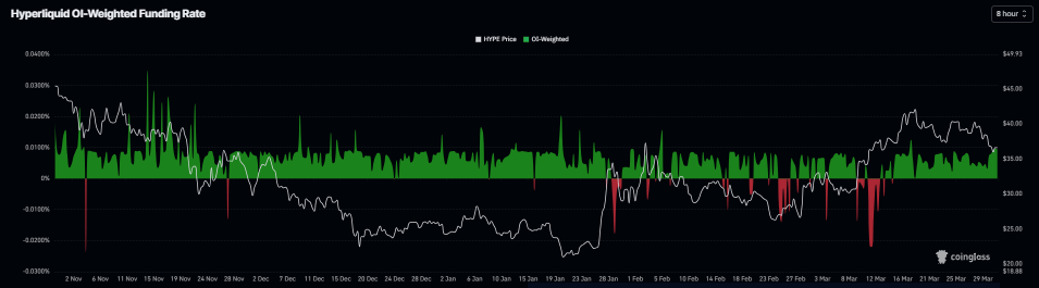 在衍生品方面,Hyperliquid 的資金費率自三月中旬轉為正值並持續保持,週三飆升至 0.0095%,表明多頭支付空頭。歷史數據顯示,如下圖所示,當資金費率由負轉正並上升時,Hyperliquid 價格通常會大幅上漲。
