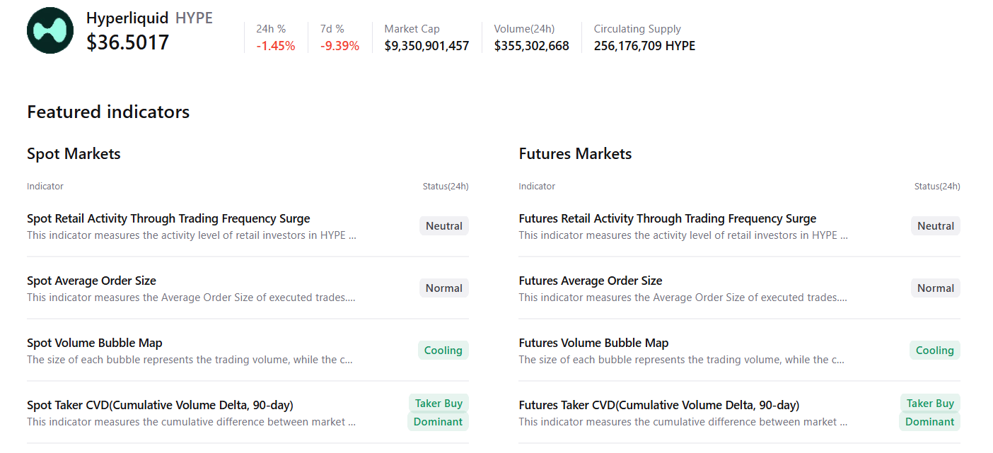 CryptoQuant 彙總數據顯示市場處於中性狀態,略偏看漲。Hyperliquid 的現貨和期貨市場顯示買方佔優且市場降溫,其他指標大多保持中性,暗示潛在的上漲走勢。