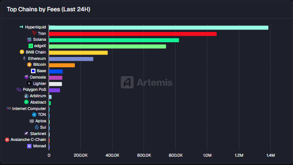 根據 Artemis Terminal 數據,Hyperliquid 24 小時鏈上手續費收入為 140 萬美元,位居手續費收入鏈條榜首,超過 Tron(TRX)和 Solana(SOL)等其他網絡,顯示交易者興趣和 HYPE 鏈流動性不斷增長。