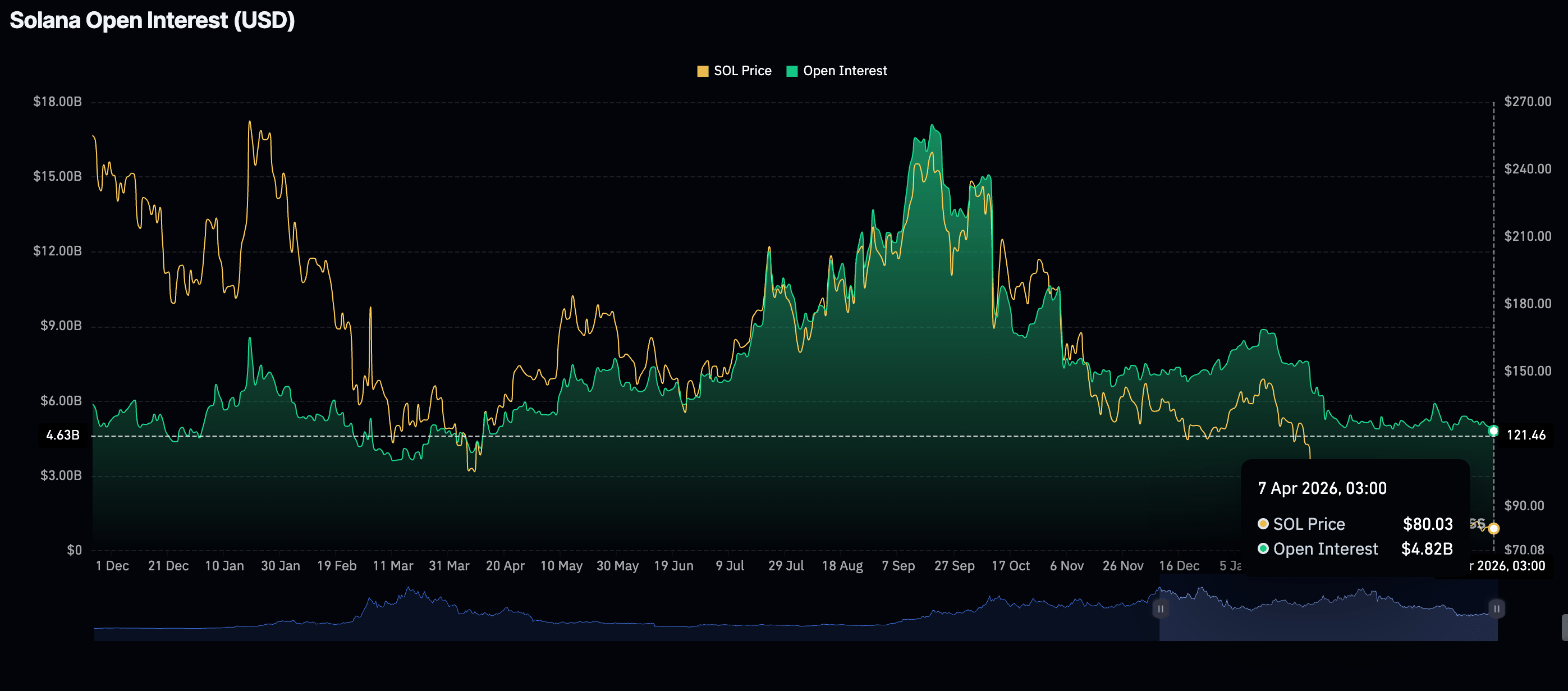 Solana面臨零售需求抑制,反映在周二期貨未平倉合約(OI)從前一日的49.7億美元縮減至48.2億美元。由於未平倉合約反映了未結期貨和期權合約的名義價值,持續下降表明投資者信心減弱,不願開設新倉位。