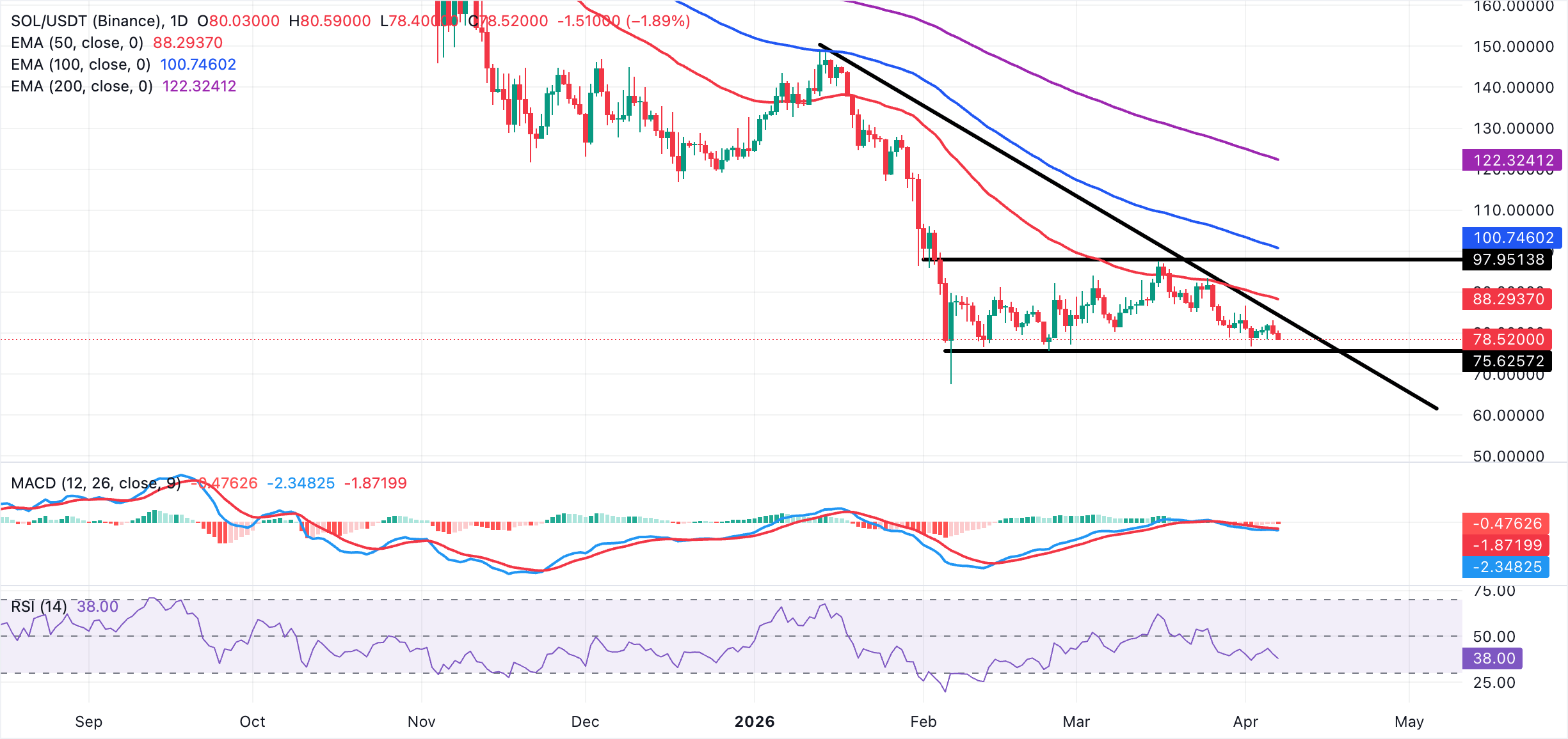 Solana現交易於約78.52美元,維持短期看跌偏向,價格延續跌破已破位的下降阻力趨勢線。現貨上方的指數移動平均線(EMA)群集,其中50日EMA現正下行至80中段,而100日和200日EMA仍處於較高位置,強化了偏向下行的背景。