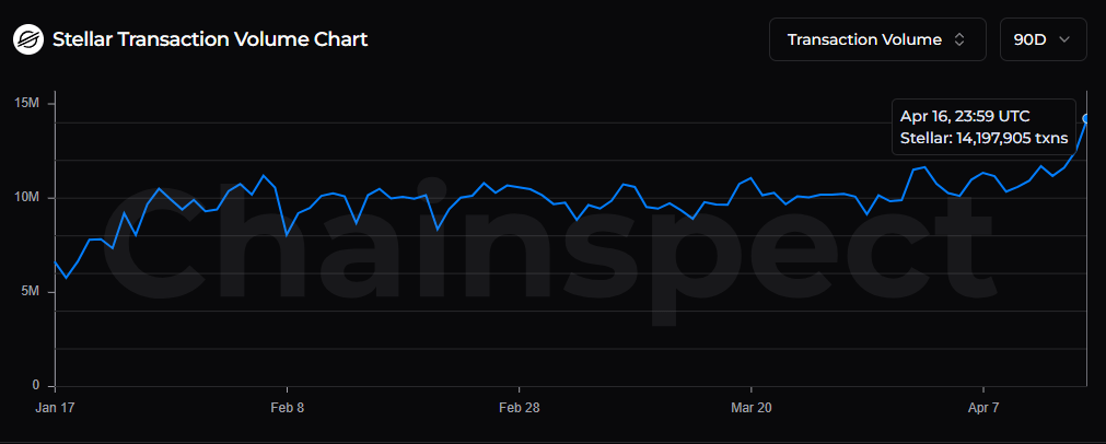 區塊鏈基礎數據追蹤平台Chainspect數據顯示,恆星幣週四處理的交易量超過1419萬筆,創過去一個季度最高水平。這些激增的交易量凸顯了交易者對XLM的興趣和流動性增加,支持看漲前景。