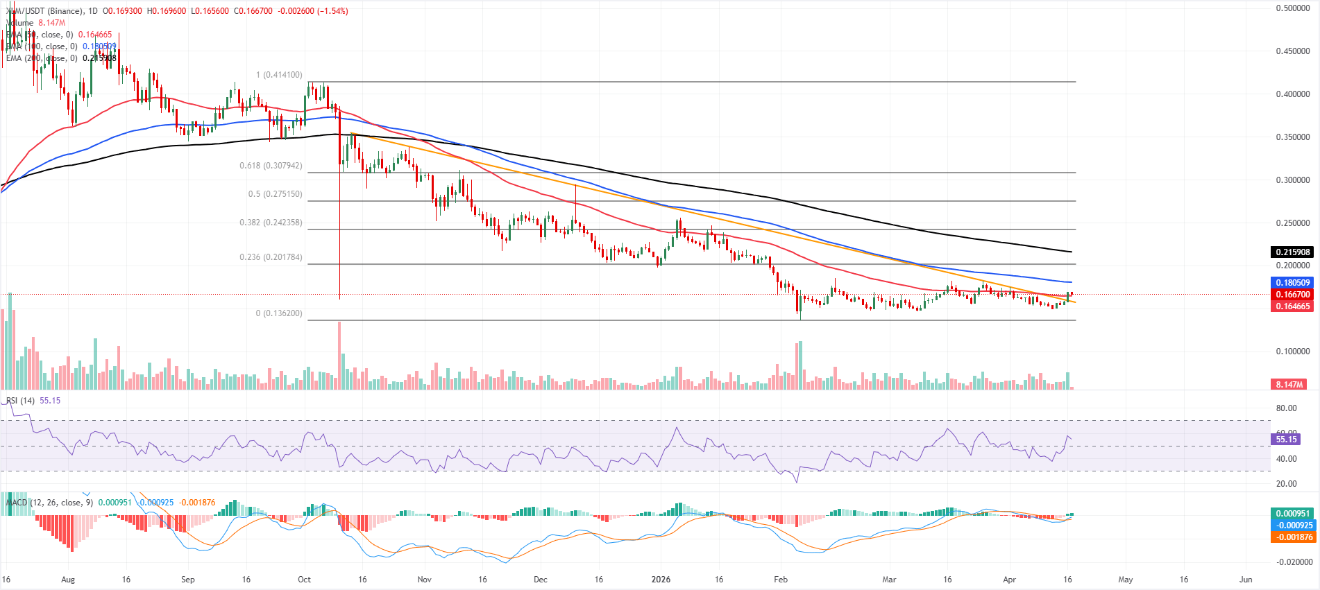 恆星幣價格週五報0.166美元,此前昨日突破了0.1580美元的下降趨勢線。XLM在中長期指數移動平均線(EMA)下方保持調整態勢,目前價格受制於100日EMA的0.180美元下方,且遠低於200日EMA的0.215美元。
