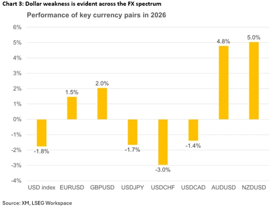 隨著其他地方的事態發展轉移了人們對英國的關注,英鎊一直受益於美元的困境。英鎊/美元在1月份上漲了2.3%——這是自2019年以來最強的年初表現——此前在2025年曾錄得7.7%的驚人漲幅。