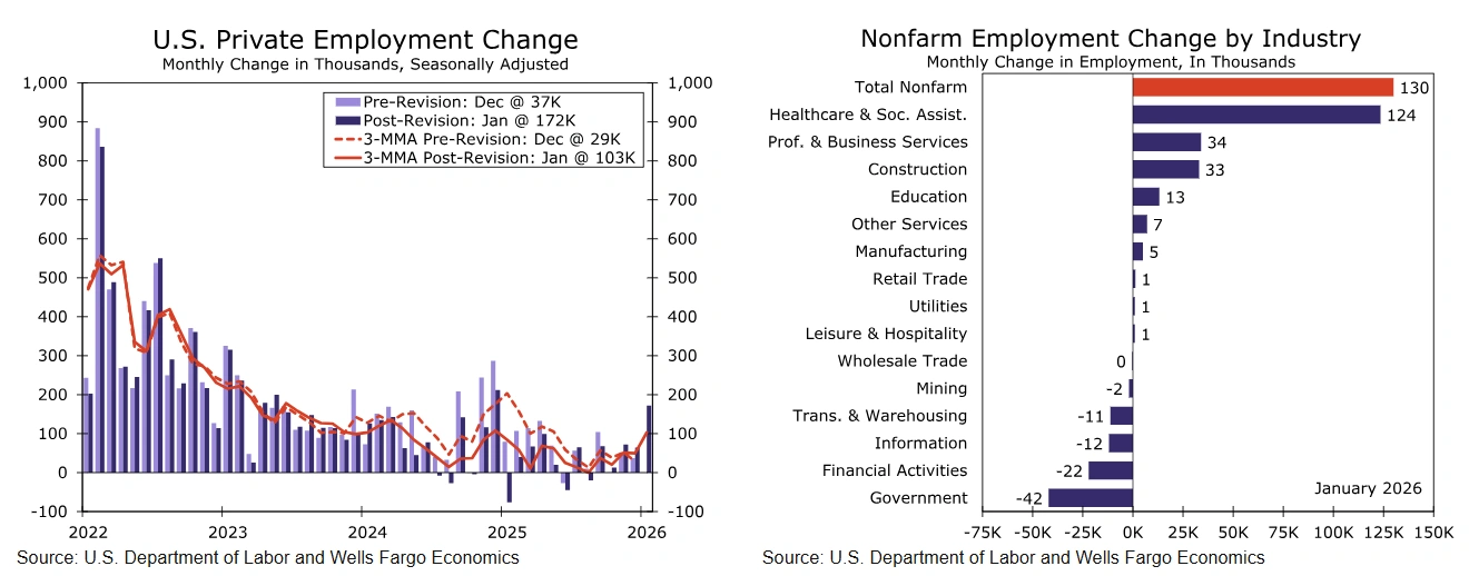 儘管修正顯示2025年全年就業增長顯著弱於初值,但近月數據表明,自去年夏季以來招聘趨勢已趨穩固。1月私營部門非農就業躍升17.2萬人,三個月平均值達10.3萬人,遠高於去年8月錄得的持平讀數(圖)。然而,醫療保健與社會服務仍是就業增長主導力量,單月新增12.4萬人——為2020年8月以來最大月度增幅。其他行業就業增長持續掙扎,凸顯就業機會遠非今日頭條數據超預期那般廣泛(圖)。