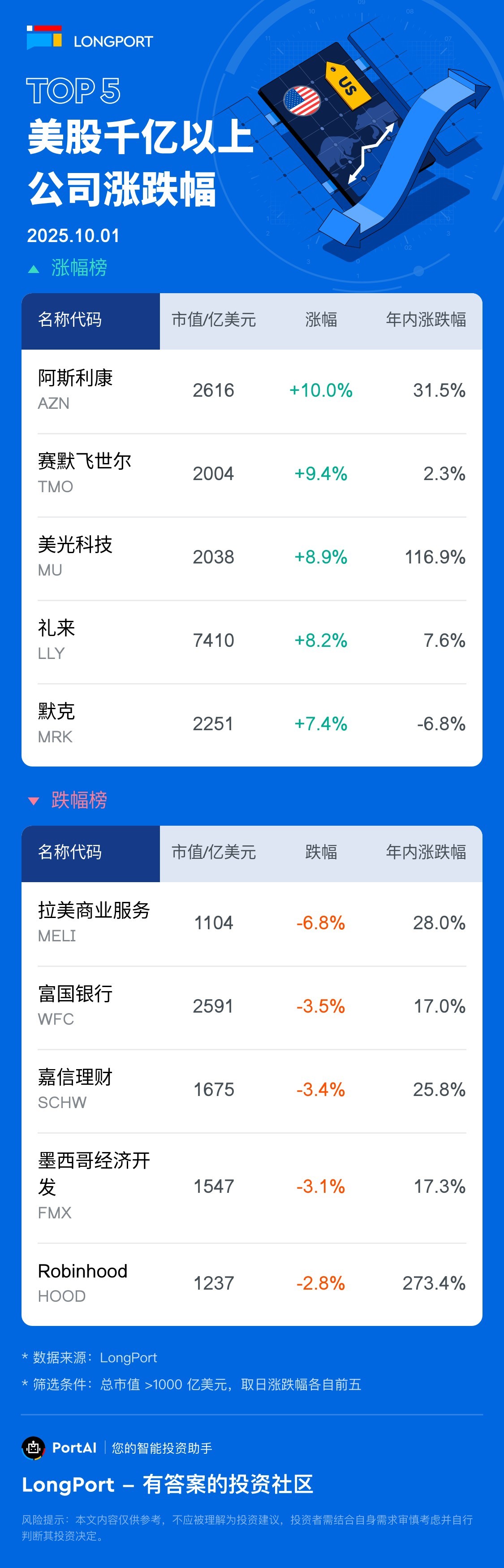 阿斯利康 (AZN) 漲 9.96%,成交額 12.0 億美元,年內累計漲 31.5%。