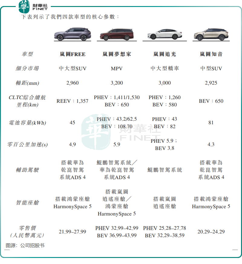於2021年6月,岚圖汽車推出岚圖FREE車型,隨後分别於2022年5月、2023年4月及2024年10月推出岚圖夢想家、岚圖追光及岚圖知音。公司產品目標人群定位於新時代中堅力量,產品主要覆蓋20萬元(單位人民幣,下同)至50萬元價格帶。