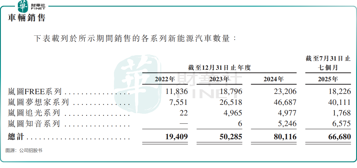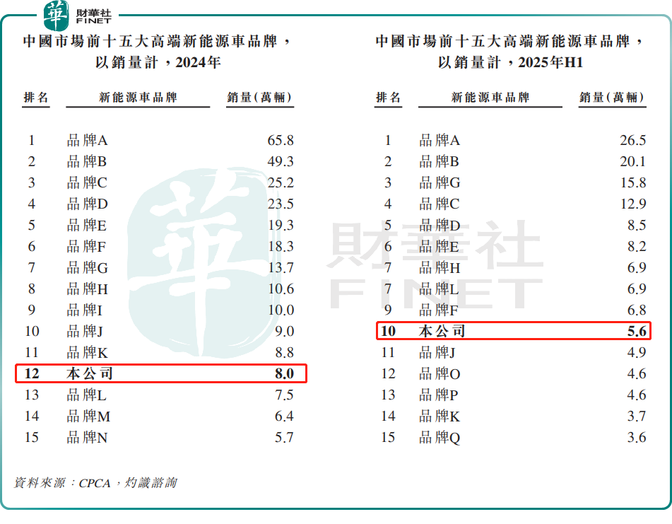 於2022年、2023年、2024年及2025年前7個月,岚圖汽車分别實現銷售約1.9萬輛、5萬輛、8萬輛及6.7萬輛汽車,2022-2024年銷量復合年增長率為103.2%,為增速第3快的中國高端新能源汽車品牌。