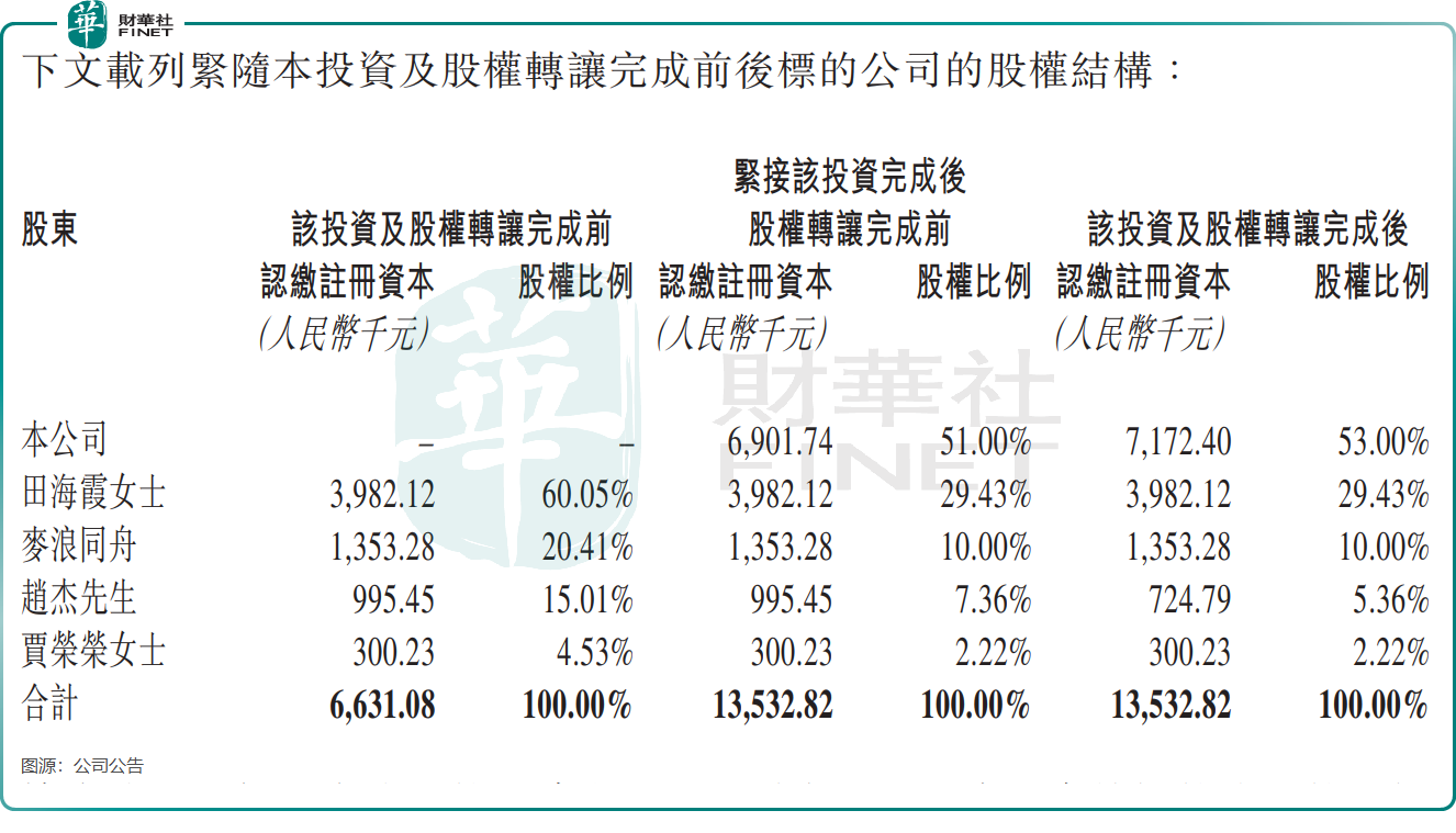 公告顯示,交易前田海霞和麥浪同舟分别持有福鹿家約60.05%及20.41%的股權;交易完成後,二者持股比例將分别降至29.43%和10%。