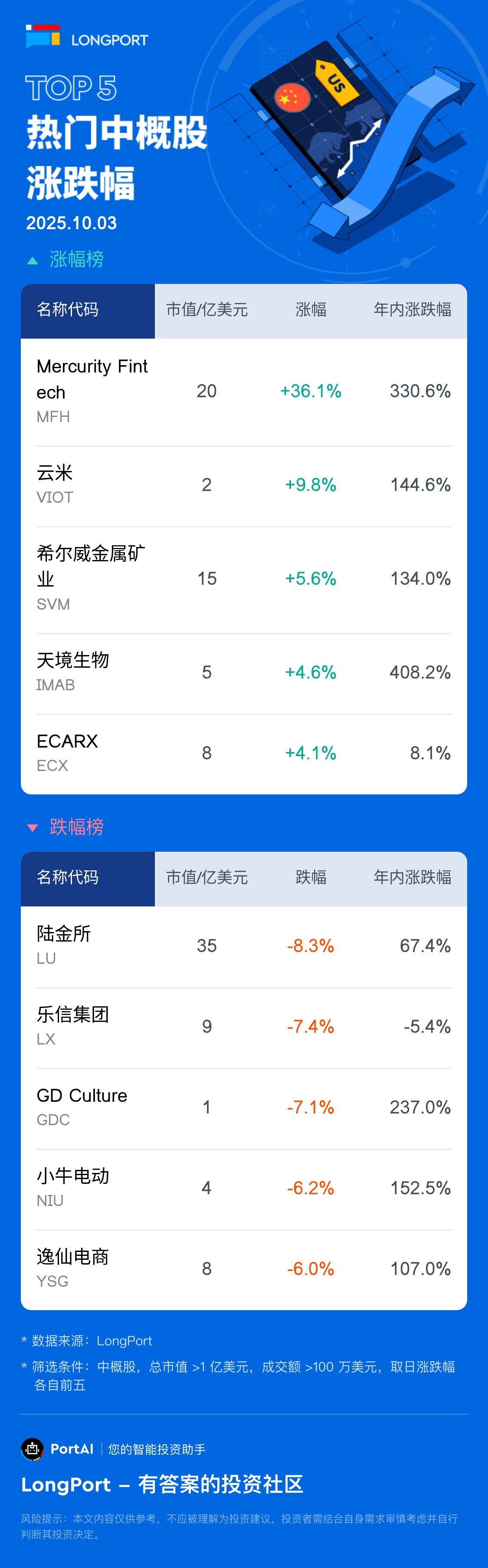 Top 5 美股千億以上公司漲跌幅(10 月 3 日)
