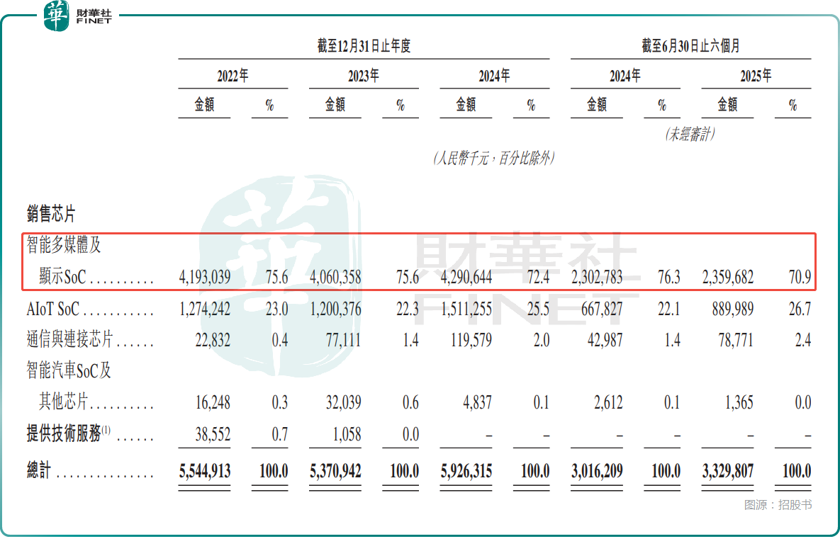 分產品來看,2022年至2024年及2025年上半年,智能多媒體及顯示SoC實現的收入佔總收入的比重分别為75.6%、75.6%、72.4%、70.9%,可見公司的業績對這部分產品依賴性較高。