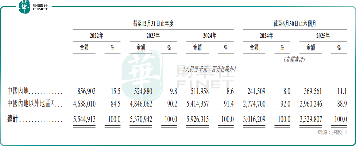 分區域來看,晶晨股份的大部分收入來自中國内地以外的市場。2022年至2024年及2025年上半年,中國内地以外地區貢獻的收入佔總收入的比重分别為84.5%、90.2%、91.4%、88.9%。