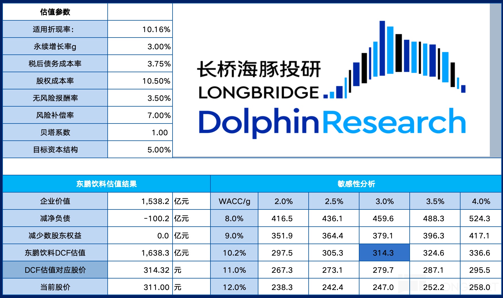 而從絕對估值的角度,WACC 我們測算給到 10.2%,最後按照東鵬未來永續增速 3% 的情況下測算東鵬的合理市值爲 1638 億元,較當前僅有 1% 的溢價空間。