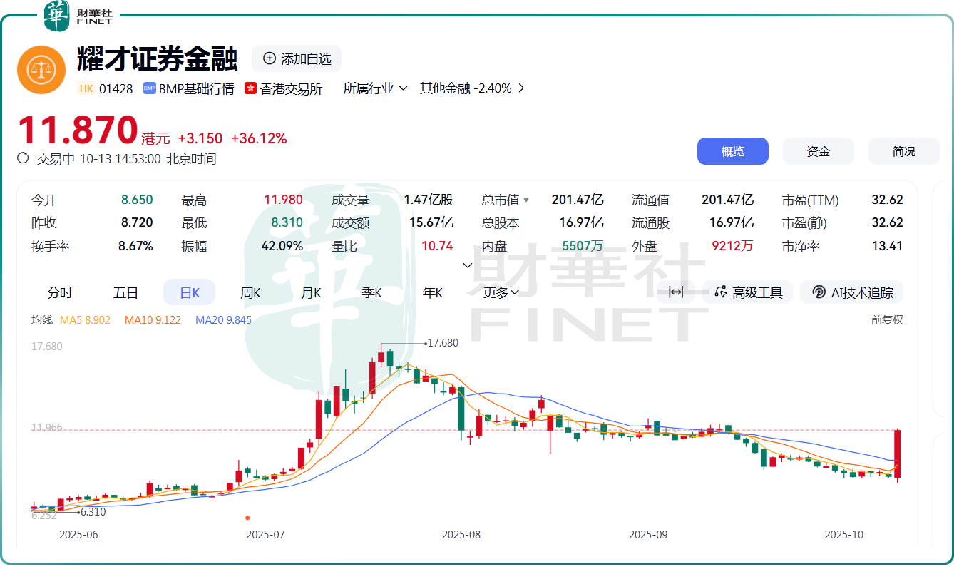 10月13日,耀才證券金融(01428.HK)午後股價上演「狂飙」大戲,截至發稿前,該股漲幅達36.12%,報11.87港元/股,位居港股漲幅榜前列。