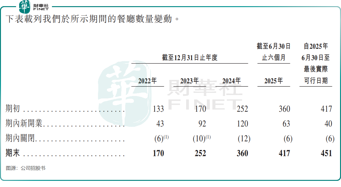 截至2025年10月8日,公司餐廳網絡已覆蓋中國内地22個城市及香港特别行政區,門店總數達451家,而在2022年時僅為170家。