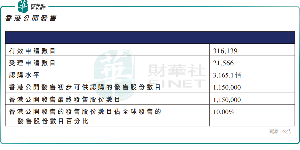根據公告,香港公開發售方面,海西新藥獲3165.1倍認購,公開發售的發售股份最終數目為115萬股股份,佔發售股份總數的約10%。合共接獲約31.61萬份有效申請,受理申請數目21566份。
