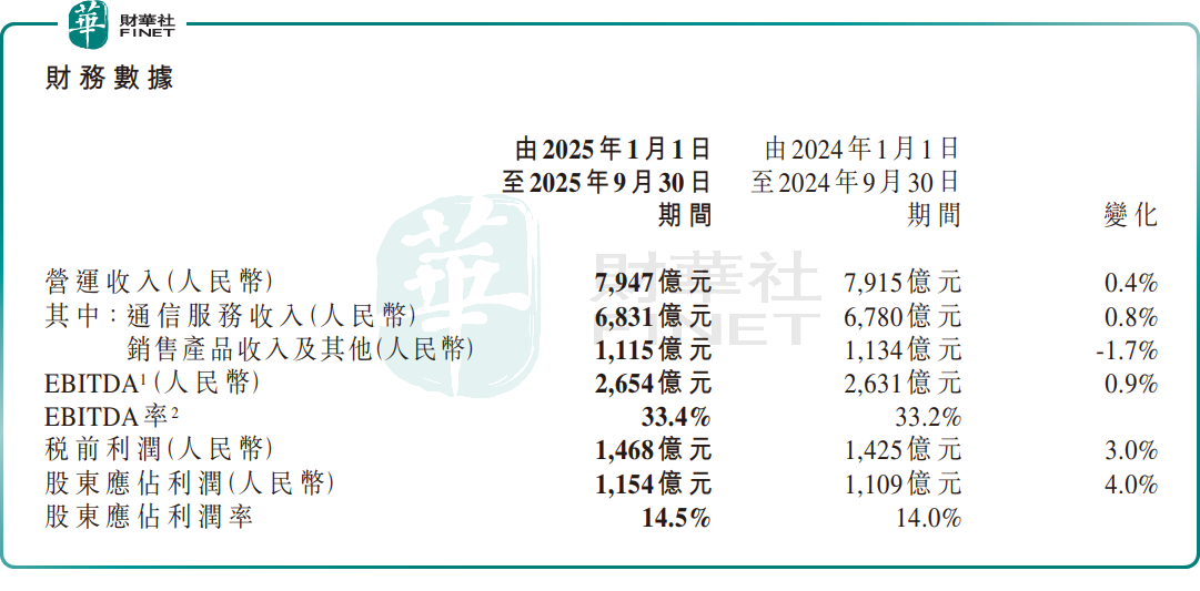 根據港交所披露的財報顯示,今年前三季度,中國移動營收7947億元(單位人民幣,下同),同比僅增長0.4%;歸母淨利潤為1154億元,同比增長4.0%,EBITDA為2654億元,同比增長0.9%。