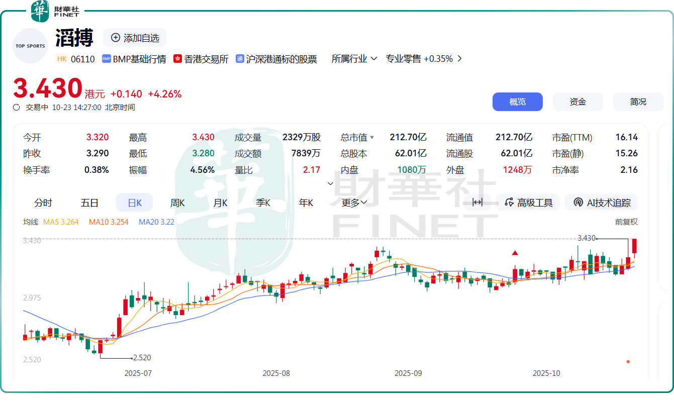 或受此影響,10月23日,滔搏股價走勢震蕩,盤初大幅拉升逾4%,但隨後迅速回落,一度下跌0.3%,多空博弈激烈。截至發稿前,該股漲幅4.26%,報3.43港元/股。