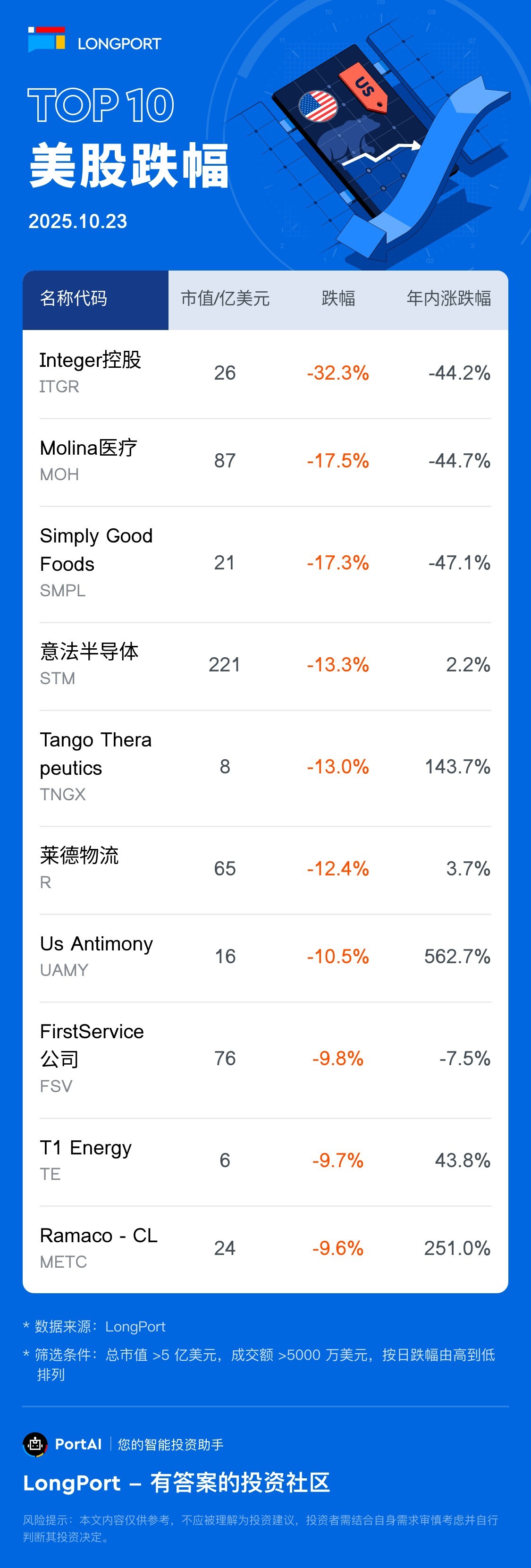 Integer 控股 (ITGR) 跌 32.28%,成交額 10.3 億美元,年內累計跌 44.2%。